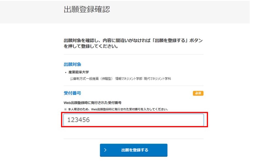 出願登録確認画面の受付番号入力欄に6桁の受付番号(インターネット出願時に発行された番号)を入力してください。