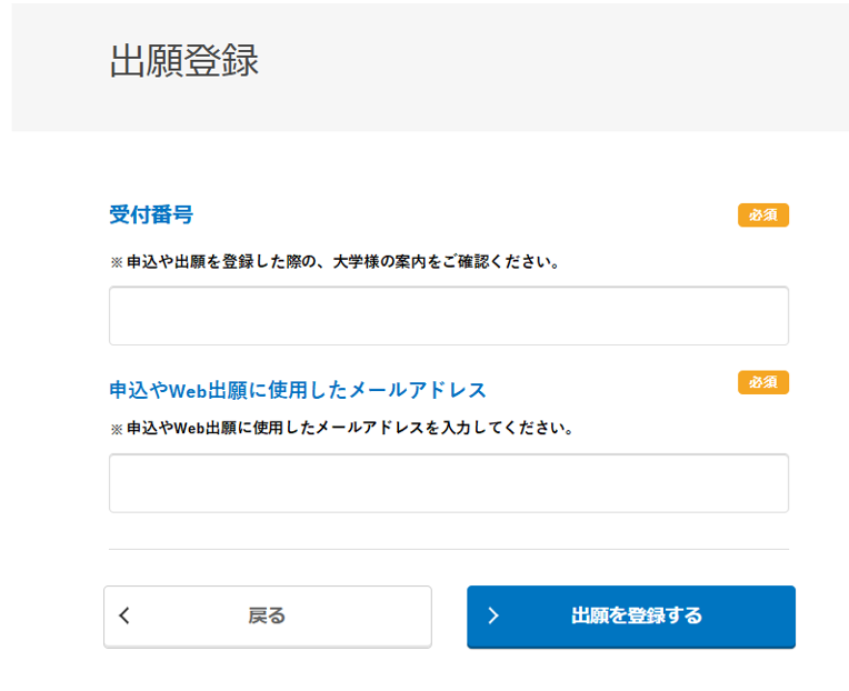 出願登録画面の受付番号入力欄に8桁の誕生年月日8桁(例えば2007年9月1日生まれの場合は、「20070901」)を入力してください。