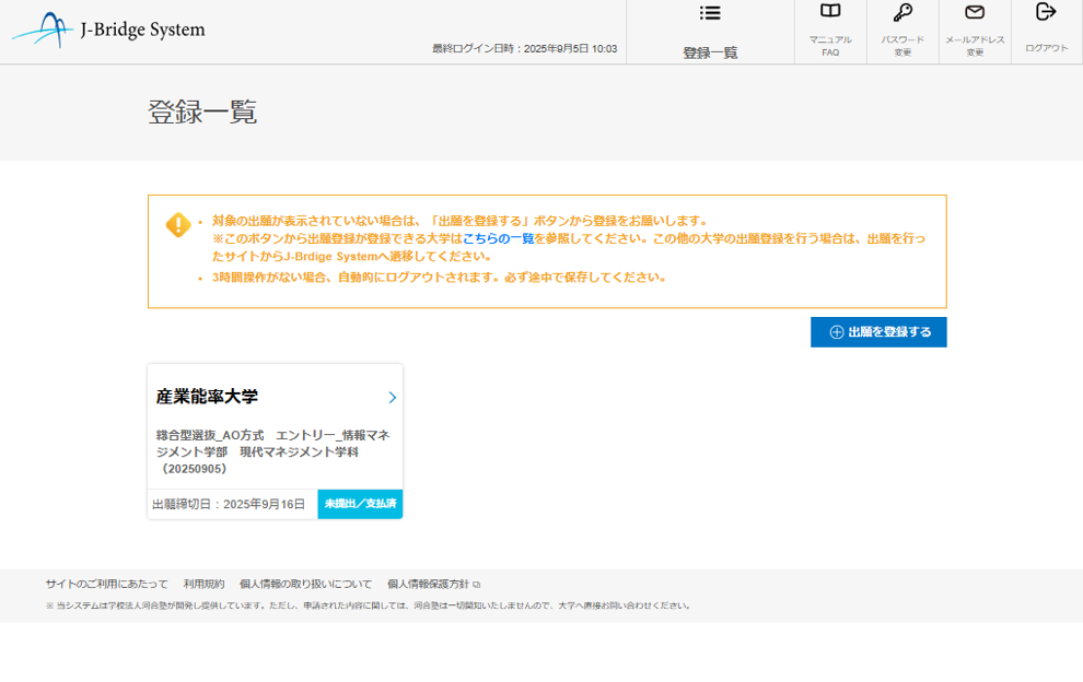 ※180分間、操作がない場合、自動的にログアウトされてしまうため、入力中の内容は必ず途中で保存するようにしてください。