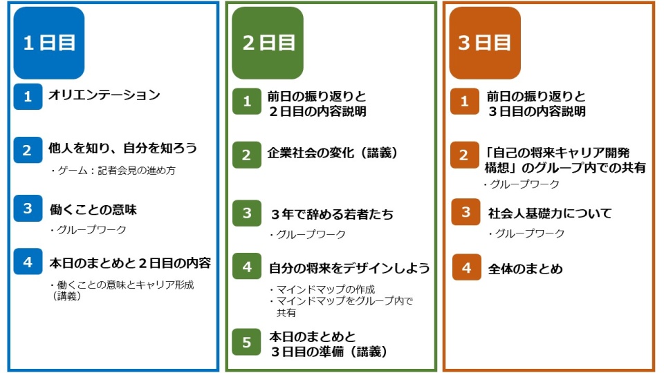 社会環境の変化と働く意味、自己の将来、求められる資質について等、高校生同士が話し合い、学び合いながら考える3日間のプログラムです。
