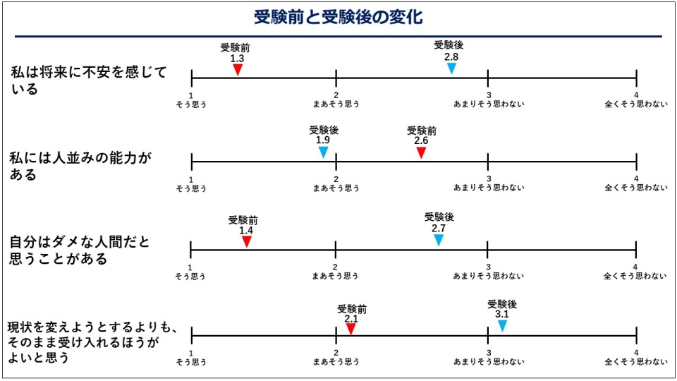 「キャリア教育接続方式」による入学者の最大の特徴は、自己肯定感の向上にあります。「高校生の生活意識と留学に関する調査報告書」を参考としたアンケート結果(別表参照)にもあるように、受験を契機に将来への展望、自己肯定感、勉学等への意欲が格段に向上しています。