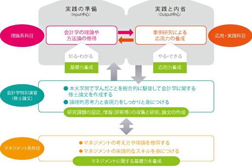 本コースのカリキュラムは、マネジメント科目の学修をベースとして会計学に関する修士論文を作成することで、会計学の理論的な面と応用・実践的な面を融合して学べる体系になっています。