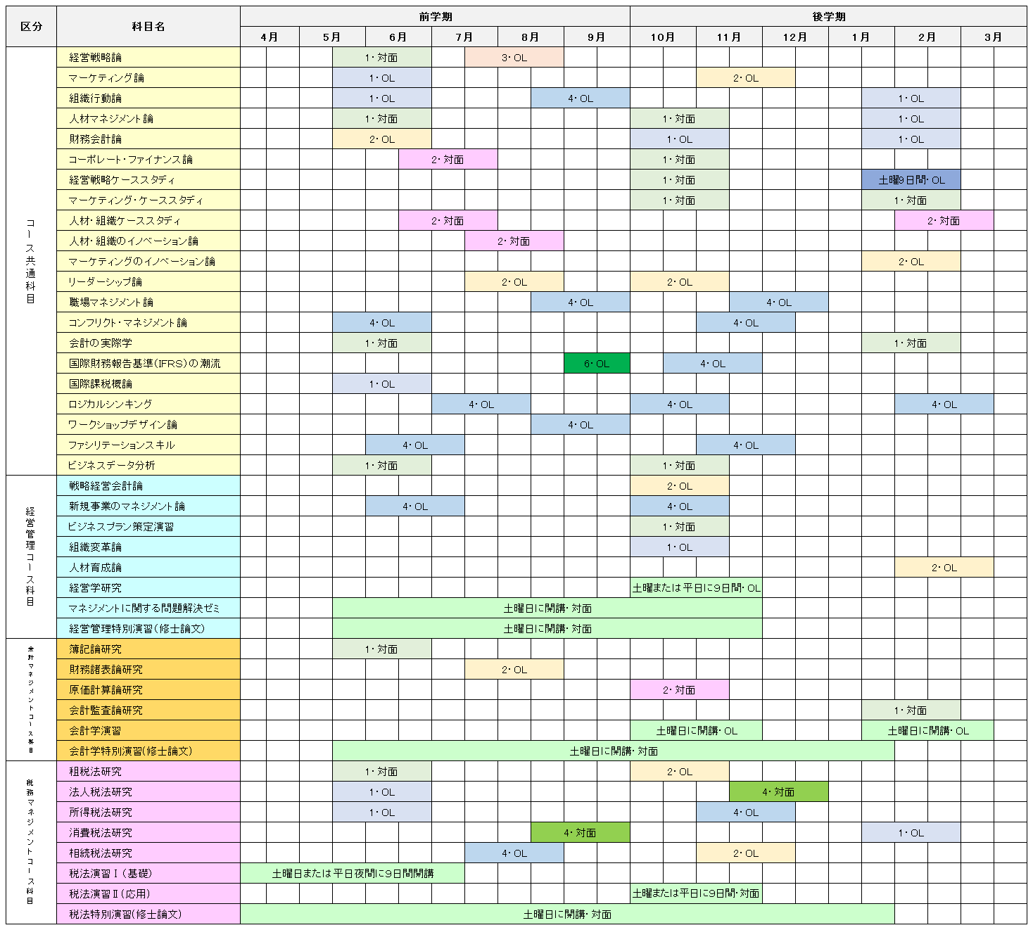 【参考】時間割概要と開講パターンおよび授業形式(対面=通学授業、OL=オンライン授業)