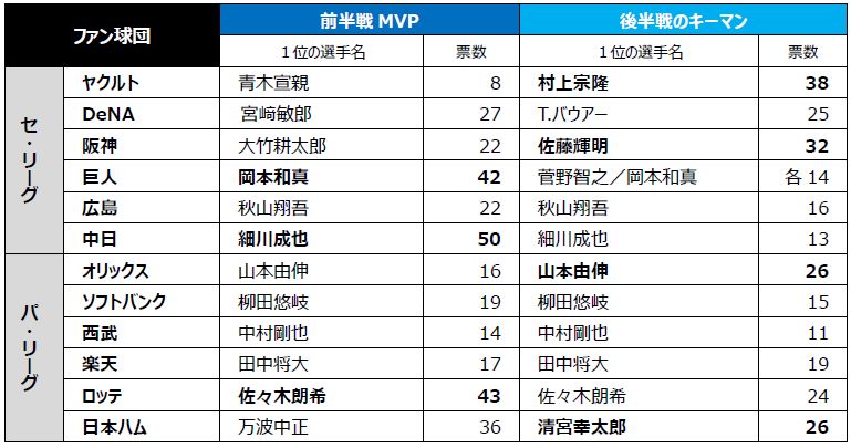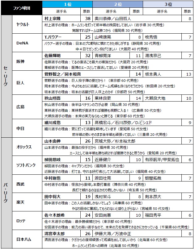 【プロ野球アンケート調査結果】各球団ファン100人に聞いた 前半戦MVP、後半戦のキーマン、タイトル期待選手