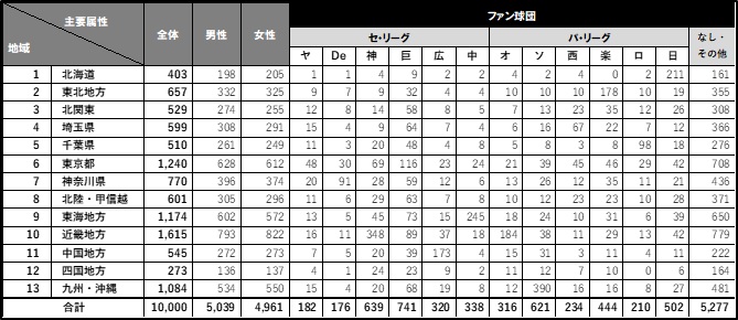 本調査対象:予備調査サンプル(下表)より12球団のファン100名ずつをランダムサンプリング