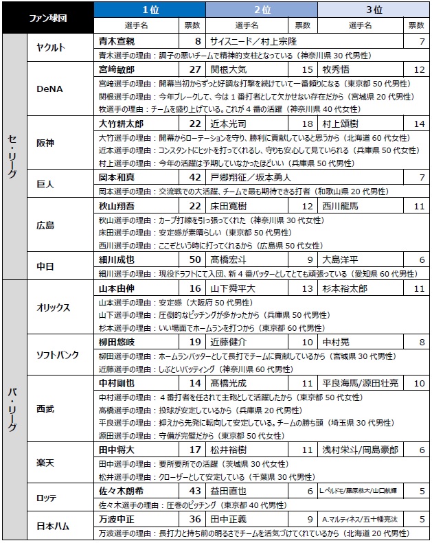 アンケート回答者は、12球団の各ファン100名の計1,200名。対象選手は、2023年6月25日現在の応援する球団の全支配下登録選手です。なお、各表の球団の並びは、昨年度のリーグ最終順位としています。