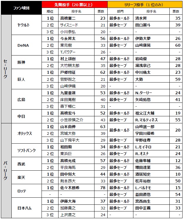 ポジションが「投手」の選手に限定した調査です。先発型でタイトルを獲ってほしい投手は2人まで、最多ホールド(最優秀中継ぎ投手)と最多セーブ(セーブ王)に輝いてほしい投手については1人ずつ選んでもらいました。。