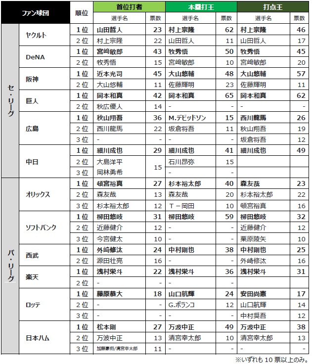 ポジションが「野手」(捕手・内野手・外野手)の選手に限定した調査です。首位打者・本塁打王・打点王の3部門について、それぞれ最もタイトルを獲ってほしい選手を1人ずつ選んでもらいました。