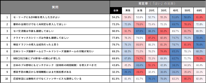 ※相対的に、肯定率が高いほど暖色、低いほど寒色で網掛け。