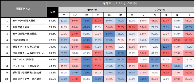 全球団のファンを対象に同一の10問を尋ね、それぞれ「はい」か「いいえ」で回答してもらいました。