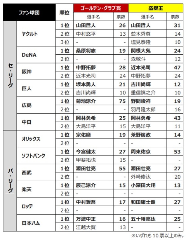 守備については、全ポジションの選手を対象に「ゴールデン・グラブ賞」に最も選ばれてほしい選手を、走塁については野手限定で最も「盗塁王」に輝いてほしい選手を、それぞれ1人ずつ選んでもらいました。