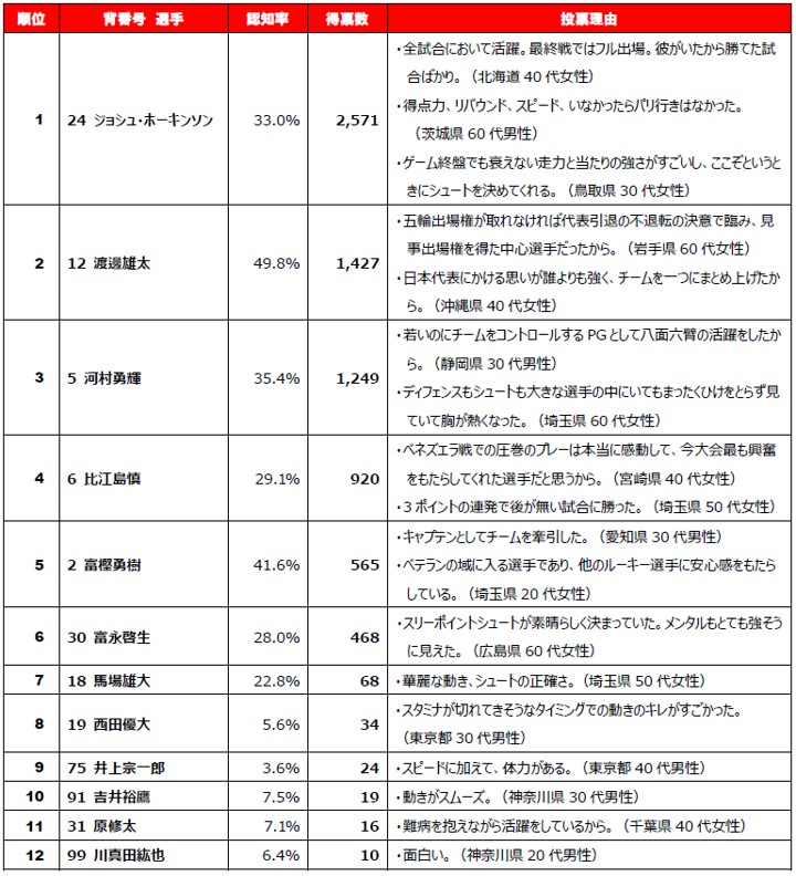1次ラウンドにおいて、世界ランキングで日本(36位)を上回るフィンランド(24位)に勝利し、順位決定ラウンドでは、さらに格上のベネズエラ(17位)にも大逆転勝利。最終のカーボベルデ戦でも勝利を収めてアジア1位の座を確定させ、2024パリ五輪出場の切符をつかみました。自国開催の2020東京五輪には出場しましたが、自力で五輪出場を決めたのは、1976年のモントリオール五輪以来、実に48年ぶりのことです。この快挙の立役者となったチーム内MVPを、日本代表全12選手の中から1人挙げ、その理由を記述してもらいました。