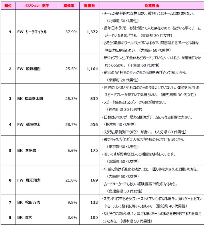 8年前のW杯2015イングランド大会では、優勝候補の南アフリカから歴史的な大金星を挙げ、一躍「台風の目」となった日本代表。自国開催のW杯2019では、予選プールを4連勝で突破、初の決勝トーナメント進出も果たしました。準々決勝で再戦した南アフリカが結果的に優勝することになったこの大会は、出場国の事前キャンプも日本国内で営まれ、日本代表の活躍に沸いただけでなく、地域との交流も通じてラグビー文化が広く浸透したことでも記憶に新しい大会です。今回のW杯2023フランス大会ではどのようなドラマが待っているのでしょうか。日本代表全33選手(8月28日現在)の中から、日本躍進のキーマンを1人挙げ、その理由を記述してもらいました(下表は得票数100票以上の選手)。