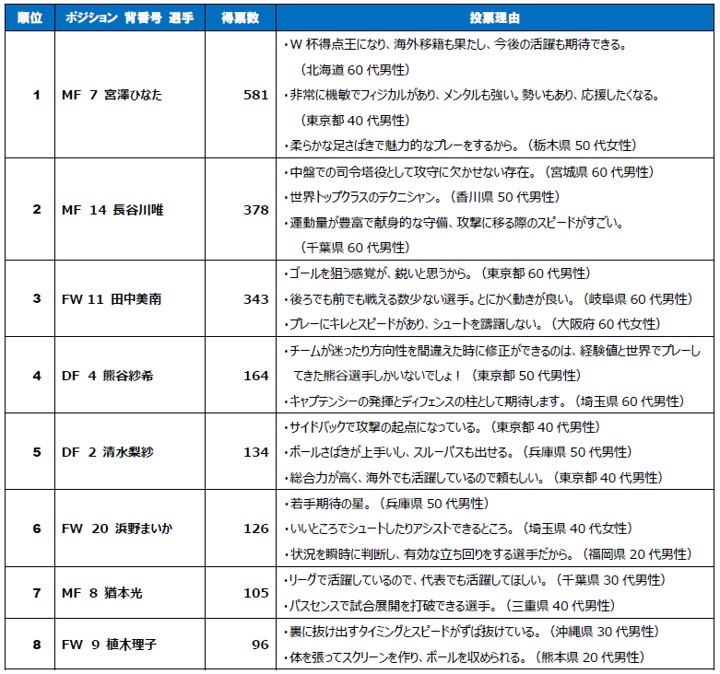 3月に東日本大震災が勃発した2011年。4か月後の7月、暗く沈む日本に勇気を与えるビッグニュースがありました。女子サッカー日本代表「なでしこジャパン」がドイツW杯で掴んだ初の世界一です。決勝戦の相手は一度も勝利したことのないアメリカ。追いついてはリードされる苦しい展開の中、2-2の同点に持ち込み、PK戦を3-1で劇的な勝利を飾りました。チーム一丸、最後まで諦めない姿勢に日本中が感動の渦に包まれ、団体としては前例のない国民栄誉賞を授与されました。あれから12年。オーストラリアとニュージーランドを舞台に開催されたW杯2023では、準々決勝でスウェーデンに惜敗しものの、グループステージでは優勝したスペインを今大会で唯一破る大健闘を見せ、低迷期を脱したとの見方もあります。女子サッカー日本代表が来年のパリ五輪において、今年のW杯以上の成績を収めるために、最も活躍を期待する選手を尋ね、その理由を記述してもらいました(下表は上位8選手、背番号はW杯2023当時)。