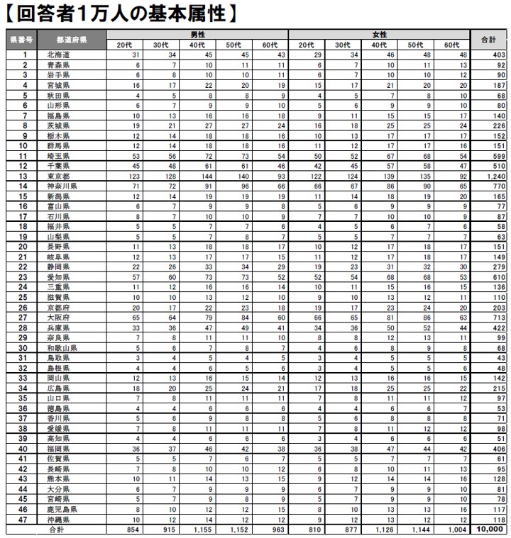 調査対象:20歳から69歳までの男女1万人(地域・性年代構成比は、総務省統計局最新推計比率に準拠)