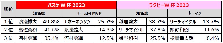 知名度1位: バスケ 渡邊雄太選手  ラグビー 稲垣啓太選手