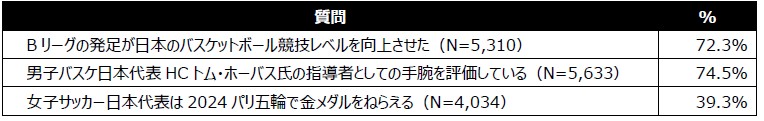 競技への関心や知識が高くないと答えられない質問については「わからない」を用意し、その選択肢を除いて該当率を算出しました。女子サッカー日本代表の2024パリ五輪での金メダルについては39.3%が「ねらえる」と回答。日本代表指揮官としての手腕については、女子サッカー監督の池田太氏に対しては43.4%、男子バスケHC(ヘッドコーチ)のトム・ホーバス氏に対しては74.5%が「評価している」と回答しました。Bリーグが日本のバスケ競技レベルを向上させたかについては72.3%が、W杯2023をきっかけにBリーグ観戦に行きたくなったかについては33.5%が、それぞれ「はい」と回答しました。