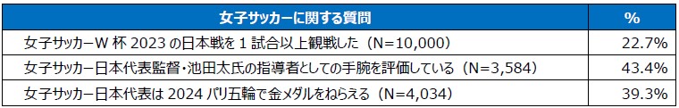 W杯2023の日本代表戦が終了した、女子サッカーとバスケットボールに関しては、観戦調査と意識調査も行いました。全サンプル1万人を対象に実施した観戦調査では、テレビ・ネットを含み、W杯2023の日本戦を1試合以上観戦した比率は、女子サッカーが22.7%、バスケットボールが38.9%でした。