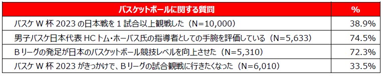 今回の調査は、FIBAバスケットボール ワールドカップ2023(以下バスケW杯2023)において、日本代表が48年ぶりとなる自力での五輪出場を決めた試合直後に実施しました。調査対象は47都道府県在住の男女1万人です。