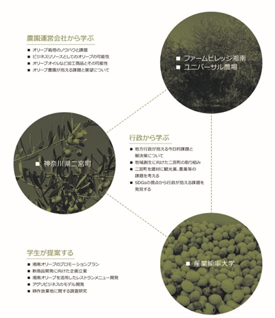 本プロジェクトは、二宮町、株式会社ファームビレッジ湘南、 株式会社ユニバーサル農場、本学の4者が連携※し、湘南産オリーブのブランド化、関連商品の開発、新しいビジネスの創出、さらに耕作放棄地問題の解決を目指すプロジェクトです。学生は授業の一環として、湘南地域で手絞りされたオリーブ油のブランド化を目指したマーケティングプランの企画立案と同時に、オリーブそのものの栽培、収穫も行っています。
