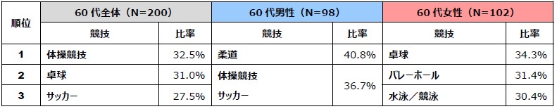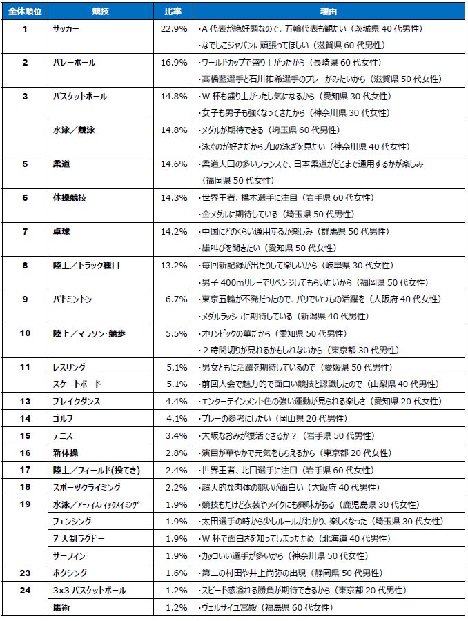 ただし属性によってランキングは⼤きく異なります。相対的に男性の⽅が回答率の⾼い競技として「サッカー」「柔道」「ゴルフ」(⼥性0.8%)「レスリング」(同3.4%)が、⼥性は「バレーボール」「競泳」「バドミントン」(男性6.0%)「スケートボード」(男性4.2%)が挙げられます。世代間に関しても、特に60 代の順位は他の世代と⼤きく違ったため、TOP3 を下の表に掲載しました。さまざまな競技に対する多様なニーズの⼀端は、総合25位までの理由記述抜粋をご覧ください。