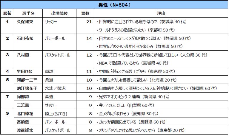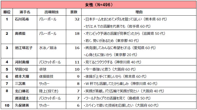 最後に、パリ五輪で活躍を期待している選⼿の名前を具体的に挙げてもらった調査の集計結果です。回答者の男⼥別にTOP10 を主な理由とともに掲載します。紙幅の都合上すべては掲載できませんが、実際には100 名を超える選⼿名が挙がりました。2024 年は注⽬選⼿の活躍、そしてニューヒーロー・ニューヒロインの誕⽣にも期待しましょう。