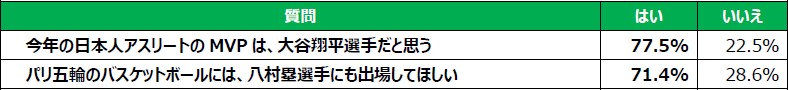 また今年、W 杯の試合を初めて国内会場で開催し、48 年ぶりの⾃⼒五輪出場を決めたことでも注⽬を集めた男⼦バスケットボールに関しては、NBA(北⽶プロバスケットボール)を優先しW 杯を⽋場した⼋村塁選⼿について、来年のパリ五輪に出場してほしいかを尋ねました。こちらの質問についても回答者の71.4%が熱望する結果となりました。