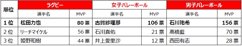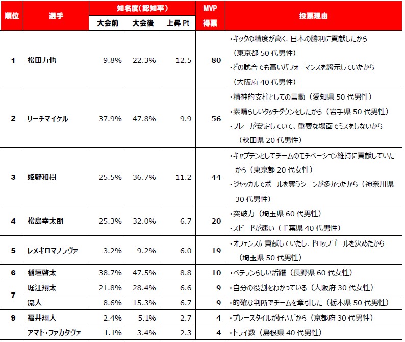 この⼤会における「⽇本代表のMVP」について調査した結果のTOP10 は下の表の通りです。正確なキックでチーム内最⾼得点を記録した松⽥⼒也選⼿が1 位(知名度の伸びも1 位)、前キャプテンとして献⾝的なプレーでチームを⽀えたリーチマイケル選⼿、新キャプテンとしてチームを引っ張った姫野和樹選⼿が続きました。