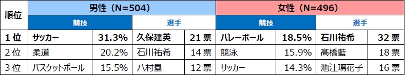 パリ五輪の期待選手1位 男性回答:久保建英選手 女性回答:石川祐希選手