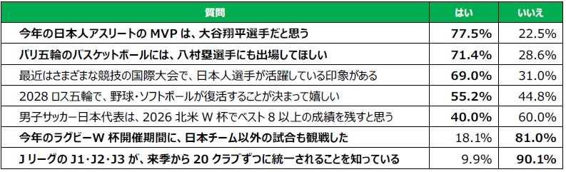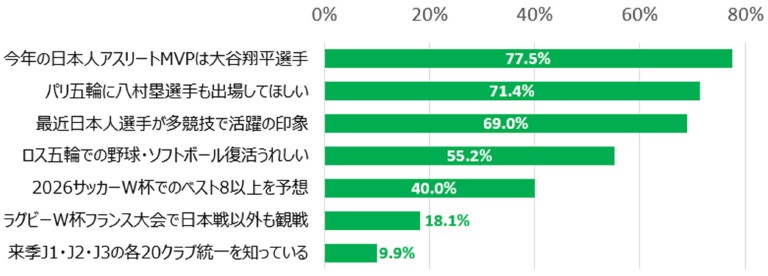 スポーツに興味関⼼のない⼈も含めて実施した⼀般⼈対象の調査にも関わらず、回答者の77.5%が、今年の⽇本⼈アスリートのMVP が⼤⾕翔平選⼿であることを肯定しました。他競技のファンや、特定の推しアスリートがいる回答者も含まれる中、この肯定率の⾼さは驚異的です。侍ジャパンのWBC 世界⼀奪還の⽴役者であることはもちろん、MLB でも⽇本⼈選⼿初の本塁打王に輝いた⼤⾕翔平選⼿の圧倒的な活躍が、普遍的に⽀持された結果といえます。