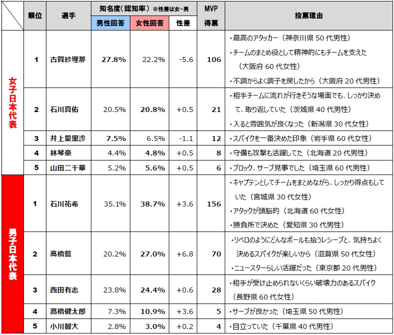 この⼤会における⼥⼦⽇本代表・男⼦⽇本代表それぞれの「チーム内MVP」について調査した結果の各TOP5 が下表になります。両者に共通しているのは上位選⼿に投票が集中している点です。性差の特徴としては、特に男⼦選⼿の認知率に関して、同性の男性回答者(N=504)よりも異性の⼥性回答者(N=496)の⽅が総じて⾼い傾向が⾒られました。