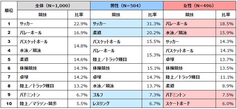 楽しみにしている競技の総合1 位は「サッカー」でした。男⼦は2022 カタールW 杯以降、さらに海外での⽇本⼈選⼿の活躍が著しく、⼥⼦も今年W 杯で成⻑を⾒せた点が背景に挙げられます。