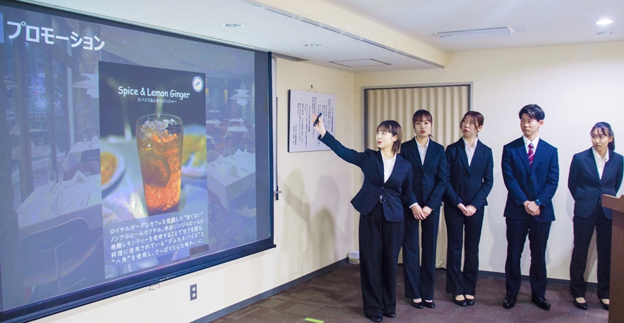 ロイヤルフードサービス株式会社の関係者を前にプレゼンテーションを行う学生達