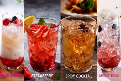 学生が企画したノンアルコールカクテル(左から)ルージュスパークリング甘酒、マリリンローゼス、スパイス&レモンジンジャー、> リンクハニーベリー