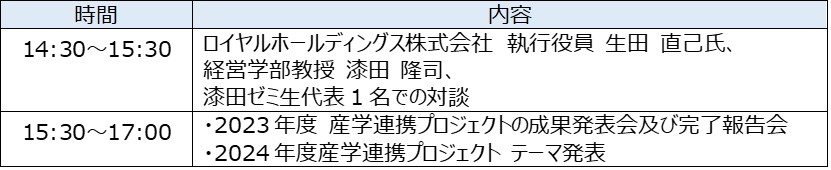 産業能率大学(東京都世田谷区、以下本学)経営学部 漆田 隆司ゼミはロイヤルホールディングス株式会社 執行役員 イノベーション推進担当の生田直己氏※1とゼミ生、担当教員の経営学部教授 漆田 隆司を交えて、これまでのロイヤルホールディングスとの取り組みを総括する対談を行います