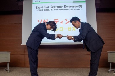 ロイヤルフードサービス株式会社 営業本部 第6営業部 Sizzler Shakey's Royal Garden Cafe 専門店営業部の遠藤洋亮部長が1位となった班に表彰状を手渡す