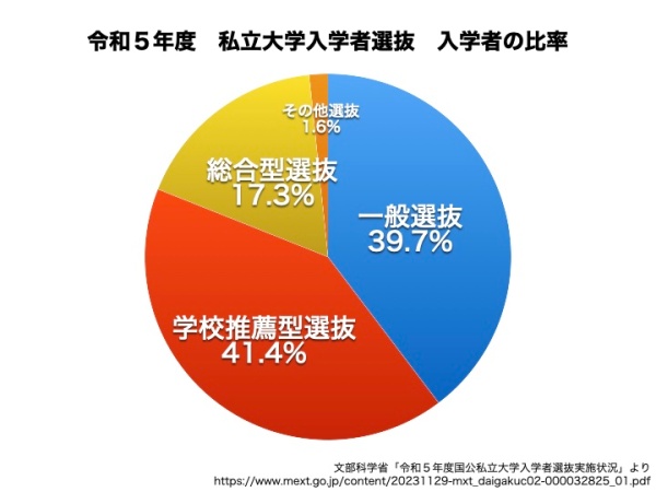 こちらをご覧ください。現在、私立大学の学生の実に6割近くが、学校推薦型および総合型選抜による入学者です。