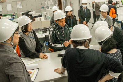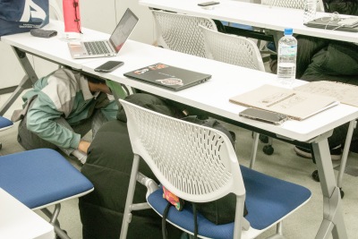 まず、館内に緊急地震速報が流れ、防災訓練開始のアナウンスとともに、大学内の自衛消防隊が発動しました。続いてキャンパス内に滞在している学生の安全確保と人数の確認を職員が行い、対面での授業教室では、教員が地震発生時の安全確保と初動対応を学生に指示しました。