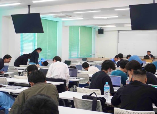 教室では、授業中に緊急地震速報が発表された想定のもと、身の安全を確保する初動訓練を行い、その後、教員が学生に被災時の行動のポイントや産業能率大学の防災対策について説明しました。