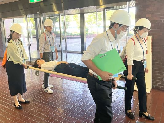 一方、職員は、自衛消防(防災)隊の訓練を実施。湘南キャンパス分隊本部を立ち上げ、各班で、情報収集・記録や校内被災状況(在校学生の人数・氏名、建物設備の被害の程度)の確認、負傷者救出救護、119番通報訓練等に取り組みました。限られた時間ではありましたが、発災時の分隊任務を具体的にイメージできる良い機会となりました。