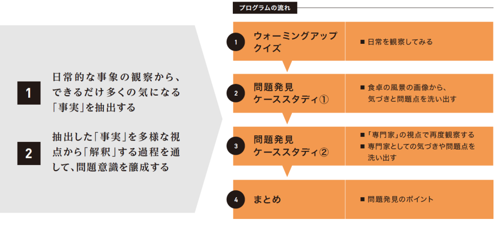 「問題発見」は、決して難しいことではありません。何気ない事象を「あたり前」と捉えず、さまざまな視点から解釈することで、身近な事象の背後にある本質的な問題を見つけることが可能となります。このプログラムは、普段、特に意識することなく見過ごしている事象に対する問題意識を高め、テーマを設定していく際のポイントをつかむことを目的としています。