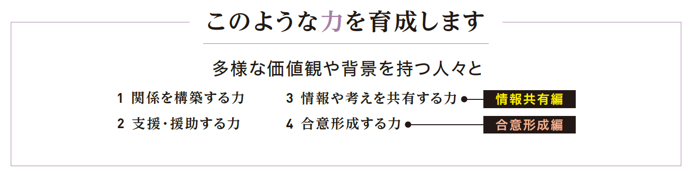 となる合意形成のポイントを理解します。チームで疑似的に探究プロセスを経験することで、協働性や傾聴、発信の重要性を理解します。