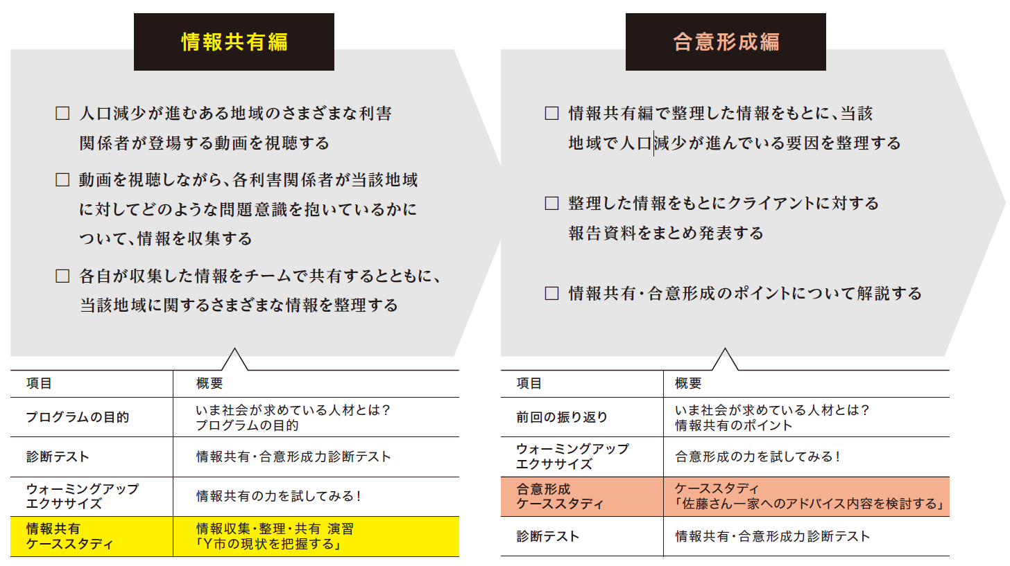 ケーススタディを用い、多様な価値観や背景を持つ人々と「情報や考えを共有する力」、「合意形成する力」を養います。インタビュー動画をもとに、親和図法やジグソー法などの手法から情報収集や分析、チームで取り組むうえで必ず必要