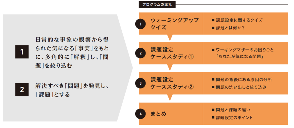 一般的に問題解決は、問題発見→原因分析→課題設定→解決策の4つのステップで展開されます。有効な解決策を提案するためには、適切に課題(問題解決に向けて取り組むべき事柄)を設定できるかが鍵となります。このプログラムでは、ケーススタディを通して、問題の背後にある原因の分析や問題の絞り込み、課題設定までのプロセスを体験的に学びます。