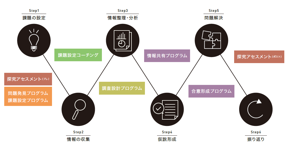 探究学習支援プログラムは、探究プロセスを6ステップに分類し、各プロセスでのトレーニングの役割を担っています。各探究プロセスを疑似的に体験することで、実際の学習での方向性を見出し、具体的に探究学習を進めることが可能となります。なお、各プログラムは、探究学習の実施状況に応じ、講師派遣や職員研修など柔軟に対応します。