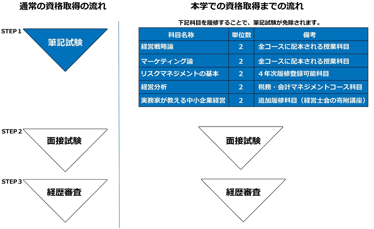 本学は、一般社団法人日本経営士会と連携しています。通信教育課程で指定の科目単位を修得すれば、環境経営士・経営士補の資格試験の一部が免除され、資格の取得が有利になります。この資格を取得すると経営コンサルタントへの道が開けます。