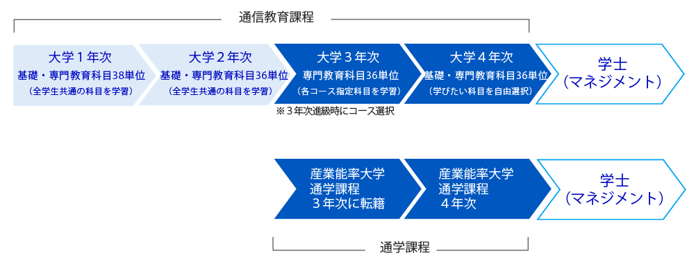 大学1、2年次は、社会人としての基礎的な知識・スキル、教養を身に付け、大学で学習するうえで必要な基礎力を培います。大学3、4年次は専門コースを選択し、マネジメントの知識と技法を系統的に学び、さまざまな分野で実践できるマネジメント力を養成します。また、大学2年次修了者は、産業能率大学通学課程(情報マネジメント学部 現代マネジメント学科)への転籍、他大学3年次編入学※の道も拓けます。