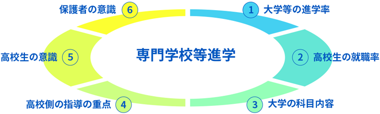 その中で専門学校等への進学を取り巻く要因として、次の6つをあげることができます。