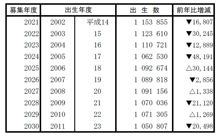 前述のとおり18歳人口は、今後10年を見ても年度で増減するものの2030年度の募集対象者は約10万人減少することがわかっています。