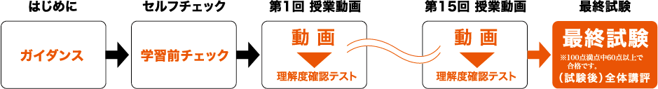 ●映像教材は学習効果を高めることができるように、1映像あたり5分前後で構成されており、スキマ時間を利用して学習を進めることができます。(各回に複数の映像があり、各回の合計は30分前後です)